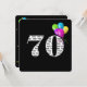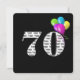 Texto preto e branco em negrito sobre fundo preto com balões coloridos para convite para festa de aniversário 70.