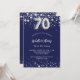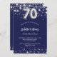 Um convite moderno, na moda e glamouroso para uma festa de aniversário 70. Um fundo azul marinho, decorado com estrelas de falso prata. Personalize e adicione seu nome e detalhes da festa. O número 70 é escrito com uma fonte no estilo do balão.