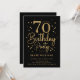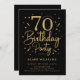 70th birthday party invitation in black and gold. Trendy modern design, perfect for a stylish men's or women's bday celebration. Features script font and confetti. Customize with your own details. Printed Zazzle invitations or instant download digital printable template.