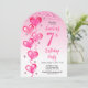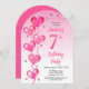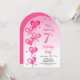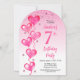 Balões de brilho fino e cor-de-rosa padronizados com cordas de fita cor-de-rosa e estrelas de sotaque cor-de-rosa "7" convite para comemoração de festa de aniversário de 7, ou personalize para idades entre 4 e 9 anos.