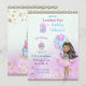 Doce princesa de aniversário com cupcake, balões e design de bolo em tons de lavanda, roxo, rosa e turquesa.