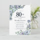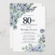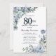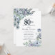 Honra uma mulher especial com este Convite de aniversário elegante e feminina. 80 é escrito em texto grande. A comemoração de aniversário segue. O nome do convidado também está em um roteiro bonito. Os detalhes da celebração do aniversário são cercados por um quadro floral azul empoeirado, que é decorado com rosas brancas e flores azuis aninhadas com folhas verdes.
