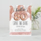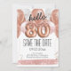 Olá, festa de aniversário 80, salve os balões rosa-brilho de data. Salve os balões rosa dourados com brilho rosado sujo. Menina, elegante, moda. Fácil de ajustar modelo.