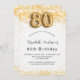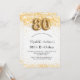 Para uma festa de aniversário elegante. Um fundo branco chic. Decorado com brilho de ouro falso, brilhos. Personalize e adicione um nome, idade e detalhes da festa. O nome é escrito com um script de estilo manuscrito. Número 80 com letra de estilo de balão.