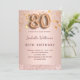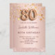 Um convite moderno, na moda e glamouroso para uma festa de aniversário 80. Um fundo metálico rosa dourado falso com estrelas douradas a pingar. O nome é escrito com um moderno e escuro, rosa dourado, escrito com letra de estilo manuscrito. Personalize e adicione os detalhes da sua festa. O número 80 é escrito com uma fonte de estilo balão, script.