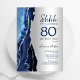 Marinho azul e prata agata 80 convite de aniversário surpresa. Elegante design moderno com cor azul-real de água agate marble geode fundo, faux glitter prata e script de tipografia. Trendy convida o cartão perfeito para uma comemoração de dia das mulheres na moda. Impressos convites Zazzle ou modelo de impressão digital instantânea para download.