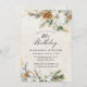 As flores brancas elegantes estão aninhadas em verde-pinheiros e minecones. O design floral é enquadrado por uma lavagem de aquarela de marfim mole, infundida com blocos de ouro macio. Perfeito para uma festa de aniversário de Natal ou de inverno.