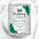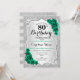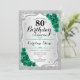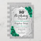 Convite de aniversário 80. Elegante design verde esmeralda floral com rosas. Apresenta faixas de prata com brilho inverso e fonte de script. Perfeito para uma comemoração de dia das mulheres na moda. Pode ser personalizado para qualquer idade! Impressos convites Zazzle ou modelo de impressão digital instantânea para download.