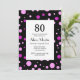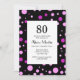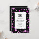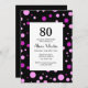 Com um pano de fundo preto chic melhorado por bolinhas lilás roxas, este convite faz uma declaração na moda para a sua ocasião especial. Comemore um aniversário de 80 de marco em estilo e com encanto com este convite único que os hóspedes irão valorizar como memória do evento incrível.