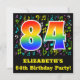 A frente deste design de convite de aniversário divertido, vibrante e colorido apresenta um grande número "84" com um padrão inspirado no gradiente do espectro arco-íris, juntamente com um nome personalizado e a mensagem "84ª Festa de aniversário!". Parte do fundo tem notas de música e padrões de símbolos divertidos e coloridos. A parte traseira apresenta detalhes editáveis sobre o evento para o qual os possíveis convidados estão sendo convidados. Cartões de convite de aniversário vibrantes e personalizados como este podem ser enviados a potenciais convidados de uma celebração a ser realizada para honrar o de um cantor, um músico, um compositor de música ou o oitenta e quarto aniversário de alguém. [~Z0000427]
