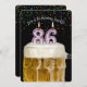 Número de 86 velas em caneca de cerveja com confete colorido em preto para convite para a 86ª festa de aniversário.
