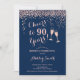 Convite de aniversário de 90. Saúde Para 90 Anos! Design elegante em azul marinho e ouro rosa. Apresenta óculos de champanhe, fonte de script e confetti. Perfeito para uma na moda 90 festa de aniversário. Personalize com seus próprios detalhes. Pode ser personalizado para mostrar qualquer idade.