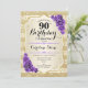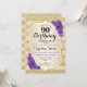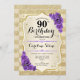 Convite de aniversário de 90. Design elegante em ouro e roxo. Apresenta faixas de ouro com brilho sutil, fontes de script na moda de rosa de de roxo e confetti. Perfeito para uma festa de aniversário de vidro.