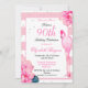 90 Birthday Flamingo e design de flores rosa. Florais e listras cor-de-rosa Um design divertido que pode ser personalizado facilmente para suas informações. No reverso, o design apresenta as listras cor-de-rosa e Flamingo repetido