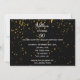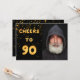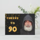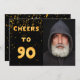 Um convite de aniversário de 90 de tendências. Com o texto: Alega-se a 90 na frente, com letras falsas de balões de ouro. Fundo preto. Com ouro confetti. Modelo para sua foto. Adicione os detalhes do evento no verso. Letras brancas, fundo preto.