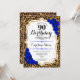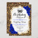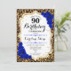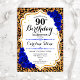 Convite de aniversário de 90. Elegante design azul-real branco com ouro brilhante falso. Apresenta a impressão de animais leopardo cheetah, a letra do script e as rosas de safira. Perfeito para uma bolsa mensageifesta de aniversario elegante. Pode ser personalizado em qualquer ano! Envie-me uma mensagem se precisar de mais personalização.
