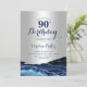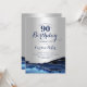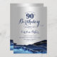 convite de aniversário 90 azul marinho e agate prateado. Elegante design moderno com cor azul-real de água agate marble geode fundo, faux glitter prata e script de tipografia. Trendy convida o cartão perfeito para uma comemoração de dia das mulheres na moda. Impressos convites Zazzle ou modelo de impressão digital instantânea para download.