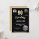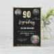 Convite de aniversário para 90 de Surpresa Metálica Dourada Moderna Celebre um marco em estilo com nosso convite de aniversário para 90 preto e Dourado Elegante. Apresentando um sofisticado fundo preto adornado com folhas luxuosas de falso ouro, este design adiciona um toque de classe a qualquer celebração. Personalizado com 3 fotos, este convite é perfeito para o fazer que o convidado de honra se sente especial. Torne a 90 inesquecível com este eterno e design chic!