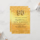 Um convite moderno, na moda e glamouroso para uma festa de aniversário 90. Um fundo metálico de ouro falso com pingos de brilho falso, aparência de pingar tinta. O nome é escrito com um moderno estilo escrito à mão. Personalize e adicione os detalhes da sua festa. O número 90 é escrito com uma fonte de estilo de balão, script.