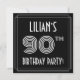 A frente deste design de placa de convite de aniversário inspirado no estilo 1920-1930 apresenta um nome personalizável, um intrincado deco de arte parece inspirado no número "90", na mensagem "FESTA DE ANIVERSÁRIO!" e em uma borda de várias linhas. Por padrão, há um fundo de cor preta na parte frontal, mas ele pode ser personalizado para uma cor diferente se desejar. A parte traseira apresenta detalhes personalizados sobre o evento, como data, hora, local/local e quaisquer outras informações importantes. Luxuoso, na moda, convites editáveis como estes podem ser usados para convidar convidados para uma festa de aniversário que está sendo realizada para celebrar o aniversário de 90 de alguém. [~Z0000615]