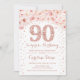 Convite de aniversário 90. Design elegante em ouro rosa e branco. Possui rosas cor-de-água pinceladas rosa, confetti e diamantes. Perfeito para uma comemoração de vidro.