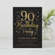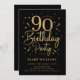90th birthday party invitation in black and gold. Trendy modern design, perfect for a stylish men's or women's bday celebration. Features script font and confetti. Customize with your own details. Printed Zazzle invitations or instant download digital printable template.