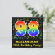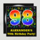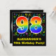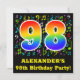 A frente deste design de convite de aniversário divertido, excitante e vibrante apresenta um grande número "98" com um padrão inspirado de gradiente de espectro arco-íris, junto com um nome editável e a mensagem "98ª Festa de aniversário!". Parte do plano de fundo apresenta notas de música e padrões de símbolos divertidos e coloridos. A parte traseira apresenta detalhes/informações personalizáveis referentes ao evento para o qual os convidados potenciais estão sendo convidados. Cartões de convite de aniversário vibrantes e editáveis como este podem ser enviados a potenciais convidados de um encontro em honra de um cantor, de um compositor de música, de um músico ou do nono oitavo aniversário de outra pessoa. [~Z0000427]