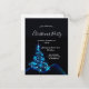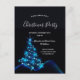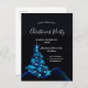 Um Convite de festas de Natal moderno e moderno em preto, azul e branco. Um fundo preto com uma brilhante árvore de Natal azul brilhante decorada com estrelas. Com o texto: Festa de Natal escrita com uma escrita de estilo moderna e moderna, com letras brancas de grande porte. Modelos para informações sobre a sua parte.