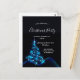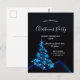 Um Convite de festas de Natal moderno e moderno em preto, azul e branco. Um fundo preto com uma brilhante árvore de Natal azul brilhante decorada com estrelas. Com o texto: Festa de Natal escrita com uma escrita de estilo moderna e moderna, com letras brancas de grande porte. Modelos para informações sobre a sua parte.