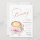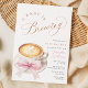 A charming baby shower invitation featuring a cozy coffee theme with a delicate pink bow accent.
