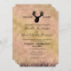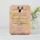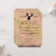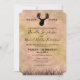 Elegante e Russo, "A Caça Acabou" Convite de casamento. Silhueta de cabeça de troféu de veado no topo com palavras "A Caça Acabou" ao seu redor. O fundo é um gradiente do céu de pinks e creme castanho claro com um gradiente cor-de-rosa a preto de grama. Mão puxada por ©Tina Hesskew de Fisheries Hunting Life.