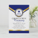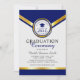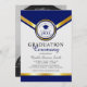 Este design de convite para a cerimônia de formatura apresenta um elegante layout formal de cores azuis, de cinza clara e douradas com chapéu azul de graduação e estrelas azuis. Personalize o seu próprio quadro de graduação no final do convite.