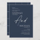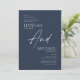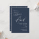 Estes convites formais para casamento de 5" x 7" apresentam um design de estilo minimalista com a inscrição de cinza clara num fundo azul marinho com os seguintes marcadores, honrados, nome de pai, introdução, primeiro casal de casamento e sobrenomes, dia da semana, data, hora, local, endereço do local e recepção.