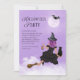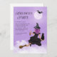 Convocação de Festa de Halloween, Testemunha Ortográfica! Esta design cativante mostra uma cena noturna mágica de lua de cheio, onde a jovem bruxa e o seu gato preto sobem pelo céu noturno roxo em sua vassoura sobre uma nuvem branca e fofa. Que comece a magia do Dia das Bruxas!