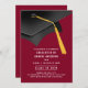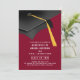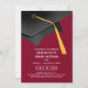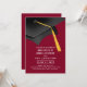 Convite para graduação de burgundy moderno com boné preto e formando dourado.