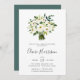Os convites para festas de formatura florais elegantes apresentam um buquê de rosas brancas de cor aquosa e peônias com folhas e folhagem botânica verde-esbranquiçada. Personalize com seus detalhes de festa de formatura abaixo em uma mistura de blocos, serifas e tipos de caligrafia.