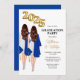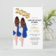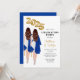 As gêmeas gêmeas convidam para a celebração de festas de formatura combinada de dupla graduação para irmãs gêmeas. Retrato de mulheres gêmeas com cabelo castanho comprido em vestido branco com vestidos marinhos de graduação em azul e bonés de formando com balões de ouro para a classe de 2025.