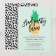 Convide amigos e família para seu luau de graduação com convites para festas de formatura divertidos. Os convites de luau de festa de formatura apresentam um abacaxi de cor d'água, fundo da casa da moeda, fonte do script de tendência, espaços reservados para o seu texto personalizado e um padrão de pontos preto e branco em negrito no verso do convite.