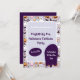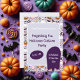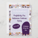 Fantasmas de Halloween, jack-o-lanternas, morcegos e doces num fundo roxo para enquadrar as informações da sua festa. Informações de RSVP no verso.