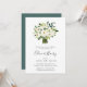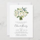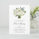 Os convites para festas de noivado florais elegantes apresentam um buquê de rosas brancas de cor aquosa e peônias com folhas e folhagem botânica verde-esbranquiçada. Personalize com seus detalhes de festa de noivado abaixo em uma mistura de blocos, serifas e tipos de caligrafia.