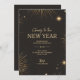 A festive New Year's invitation card featuring gold fireworks on a black background. Text reads "Cheers to the New Year" with event details below.