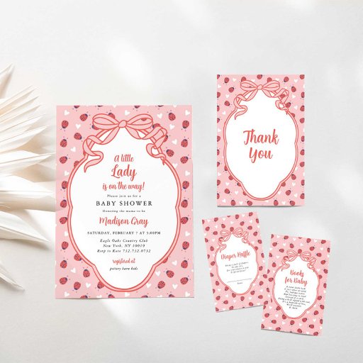 This elegant invitation is the perfect way to honor the upcoming arrival of your little one. Featuring a ladybugs and hearts, tied with a bow and sophisticated colors, it sets the tone for a refined yet love-filled celebration. Ideal for a ladybug themed baby shower, this invitation captures the love of new life!. #lovebugontheway #babyshowerinvitationgirl #Babygirlbabyshowerinvitation #ladybugbabyshower