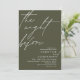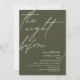 Anuncie a sua alegria para sempre em estilo com o nosso moderno design do ensaio de celebração do ensaio de noites verde-oliva (The Night Before). É ideal para casais que decidiram celebrar a noite antes do seu grande dia. Com seu design sofisticado, mas lúdico, este convite certamente define o tom de um evento inesquecível. A carta de convite apresenta o moderno design de roteiro romântico, adicionando um toque de elegância do eterno à sua celebração. Projetado por TeeshaDerrick