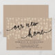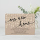 Nosso novo cartão de convite de festas de casa, de aquecimento doméstico, no moderno tema das luzes de cordas castanhosas da cabeceira rustica. Planejar uma festa para celebrar sua nova casa com sua família e amigos? Convide seus hóspedes com este cartão de convite de festas de inauguração.