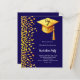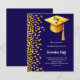 Um convite moderno e elegante para a Festa de formatura. Um fundo azul escuro decorado com confete dourado falso e um boné de formatura grande com tassel. Personalize e adicione um nome e detalhes da parte. Texto branco. 1 folha = 1 convite impresso de borda a borda.