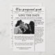 Proposta minimalista de casamento do jornal postscript salve a data com três fotos, incluindo uma do noivo e noiva quando eles propuseram.