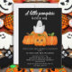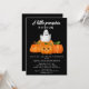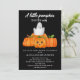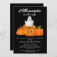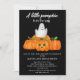 Celebre seu chá de fraldas de outono em estilo festivo com este charmoso convite "A Little Pumpkin is on the Way". Apresentando um fantasma giro a espreitar de uma abóbora laranja rodeada por abóbadas de outono, esta design inspirada no Dia das Bruxas é perfeita para os pais a serem que amam temas sazonais. O fundo negro arrojado faz o trabalho de arte lúdico e o pop branco moderno, criando um olhar na moda, mas caprichoso. Personalize com seus detalhes de chá para um convite memorável que é ideal para comemorações do outono, chás de fraldas com tema de abóbora ou reuniões de outubro.