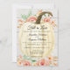 Tábuas de shiplap brancas suavemente envelhecidas para uma textura de madeira vintage realça a abóbora e os rosas cor-de-rosa coral e pêssego e o desenho floral com folhas brilhantes douradas. Design rústico, mas elegante, perfeito para um casamento em um dia de outono fresco! A arte foi pintada à mão por Audrey Jeanne Roberts. Conjunto completo disponível para coordenar. Direitos autorais.