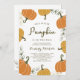 Convide seus convidados para o seu evento sazonal de chá de fraldas de outono com este adorável convite "Our Little Pumpkin's on the Way!" que inclui um quadro de borda de abóbora com ilustrações de folhas multicoloridas. Personalize o convite ao seu gosto.