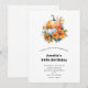 Convite de aniversário com imagem temática de outono. Abóboras laranja e brancas cercadas por folhas de outono e flores alaranjadas-amareladas.